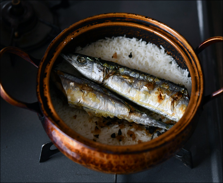 (19cmの煮込み鍋で秋刀魚の炊き込みご飯を。豆豉と塩ライムを使って。仕上げには香菜をどっさり。)